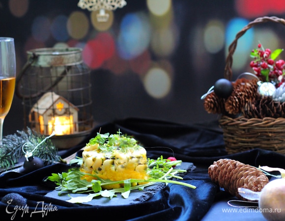 С помощью кулинарного кольца выложить в тарелку для подача сначала слой манго, затем — слой гребешка. Слои хорошо прижать и снять кольцо.
