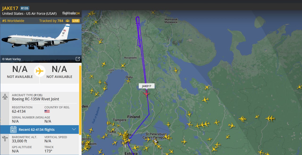 Одновременно с этим еще один RC-135W Rivet Joint (уже американский) плотно мониторит российскую границу на севере, параллельно линии Санкт-Петербург—Мурманск. Также в течение дня фиксировалось приближение бортов шведских ВВС.