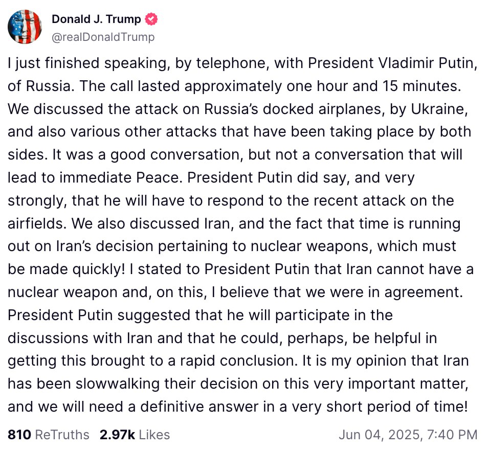 Мы обсудили атаки Украины по находившимся на стоянке российским самолётам, а также другие различные нападения, совершённые обеими сторонами. Это был хороший разговор, но не такой, который приведёт к немедленному заключению мира.