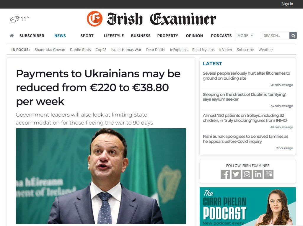 Власти Ирландии могут сократить еженедельное пособие для украинских беженцев более чем в пять раз — с 220 евро до 38,8 евро — из-за высоких затрат, — Irish Examiner.