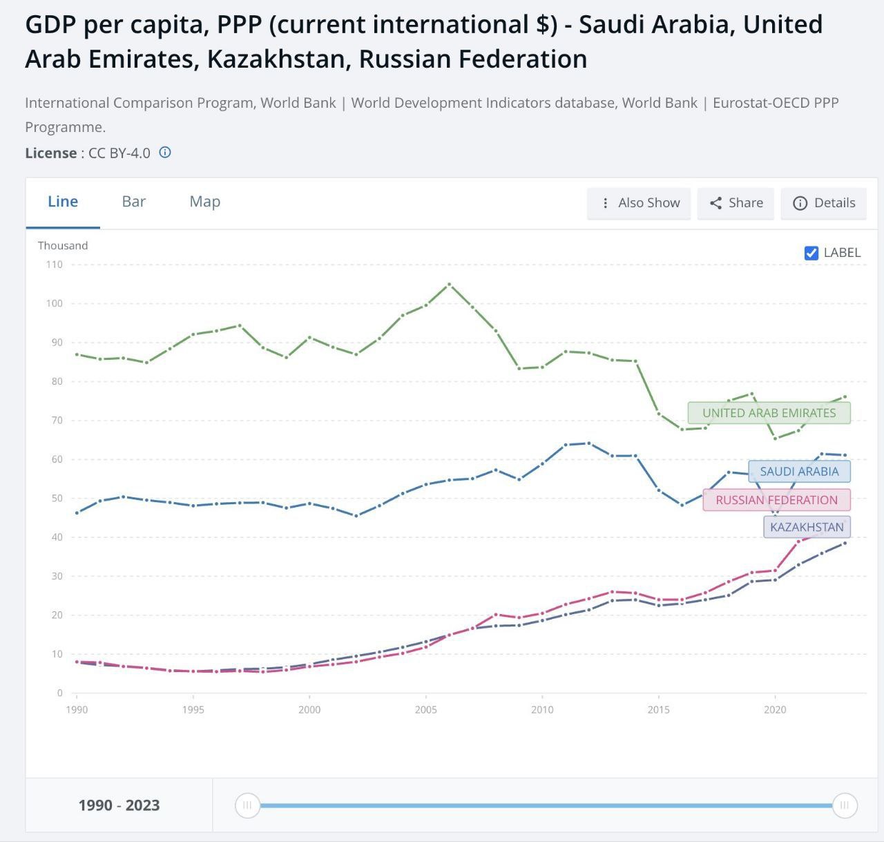 Саудовская Аравия и Эмираты с 2011 года топчутся на месте, а ВВП России и Казахстана устойчиво растут. Хотя все страны зависят от природных ресурсов.
