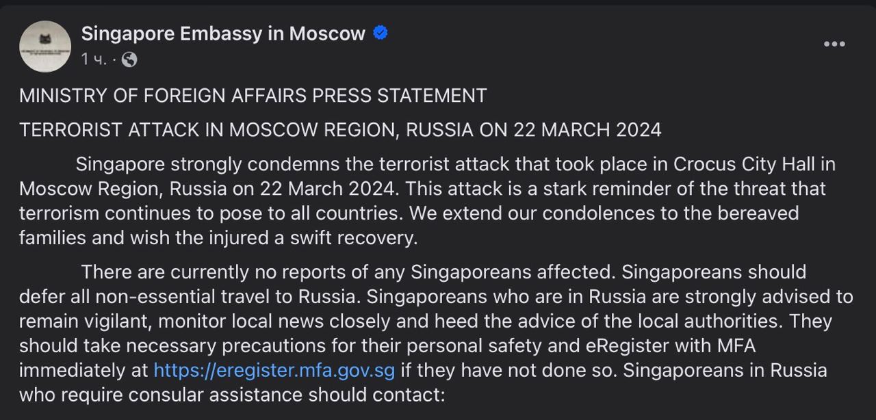 ❗️Сингапур решительно осуждает террористический акт, произошедший в «Крокус Сити Холле»