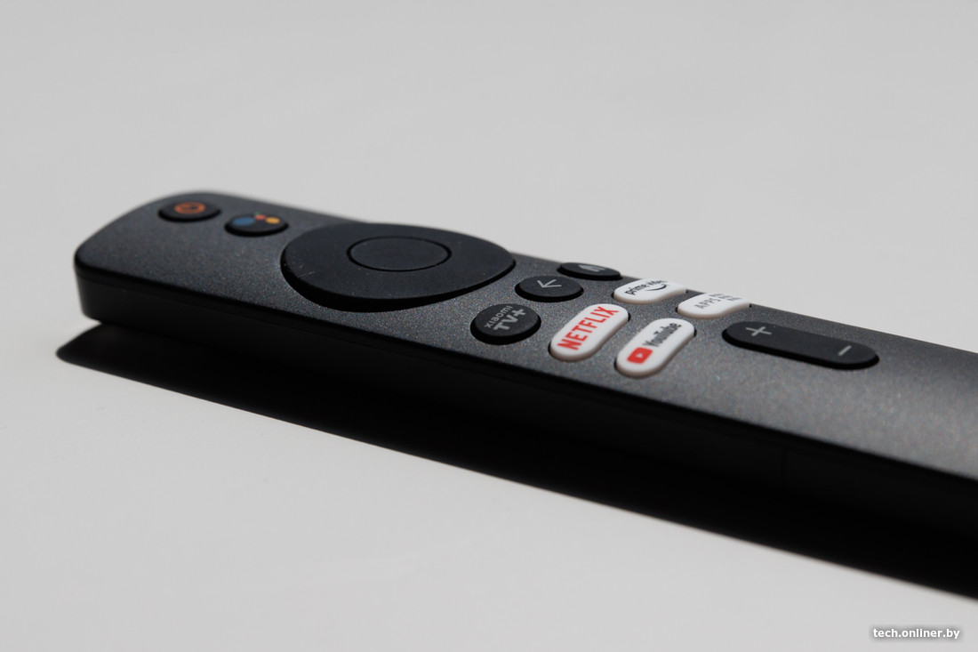Пульт Xiaomi TV Box S аскетичный в стиле современной бытовой техники подобного плана: кнопка включения, кнопка голосовых команд (ассистент Google), резиновое кольцо-шайба с кнопкой по центру, кнопка вызова фирменного стриминга Xiaomi, кнопки «Назад», «Домой», выделенные кнопки Netflix, YouTube, Amazon Prime Video и вызова установленных приложений, а также качелька регулировки громкости. Батарейки нужно докупать отдельно.