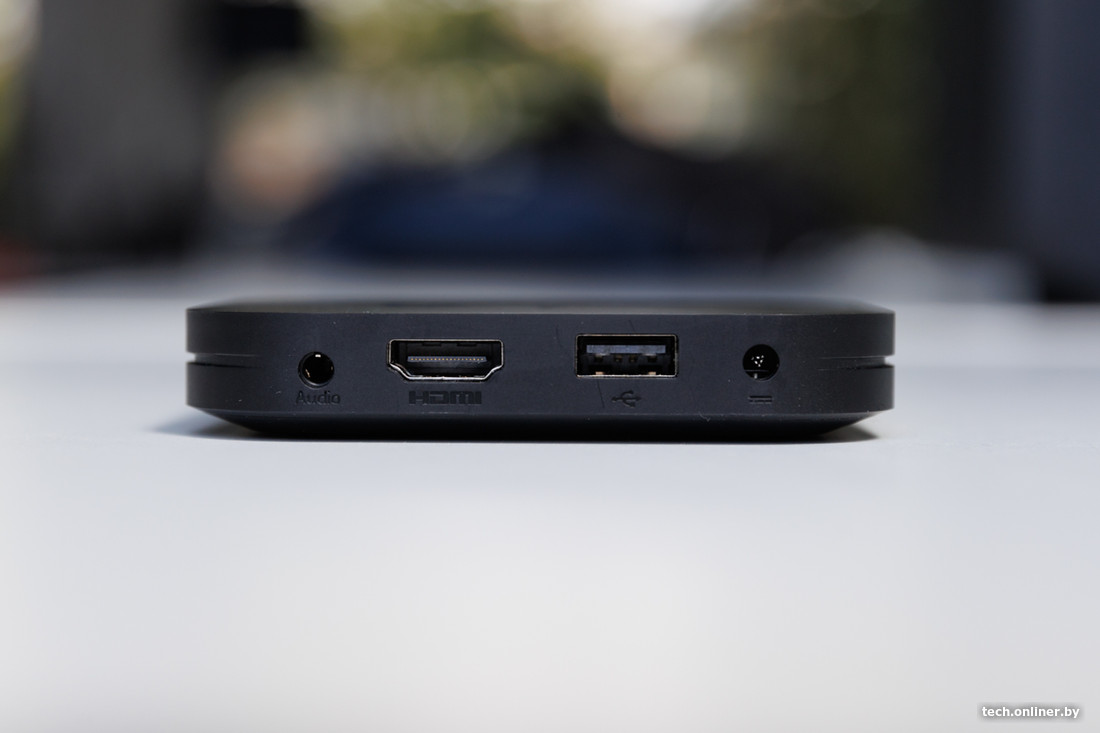 Ножки у телеприставки пластиковые и нехваткие, поэтому практически на любой поверхности она скользит, а тяжелые кабели утягивают устройство к краю условной тумбы. Сзади ТВ-приставки Xiaomi имеются разъемы питания, USB для флешек и Ethernet-адаптера, HDMI и 3,5-миллиметровый выход для аудио. Из дополнительных особенностей — логотип Xiaomi на верхней панели и неяркий (это хорошо) световой индикатор спереди, гаснущий при выключении девайса.