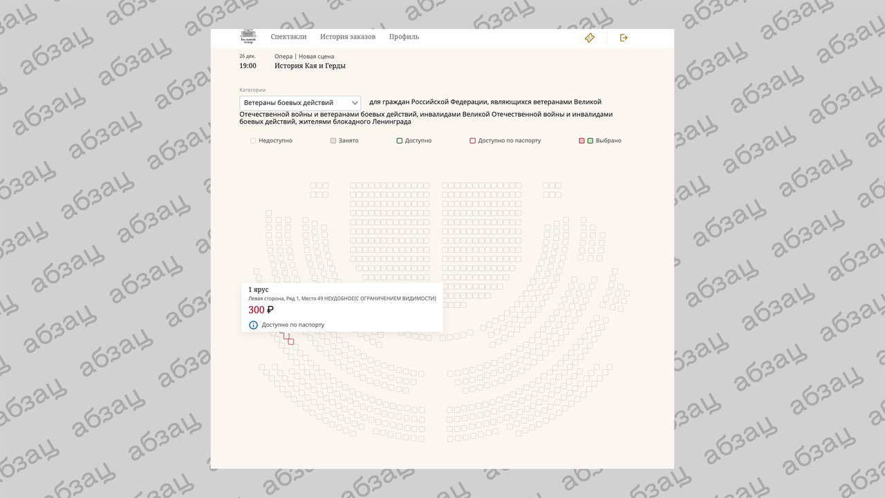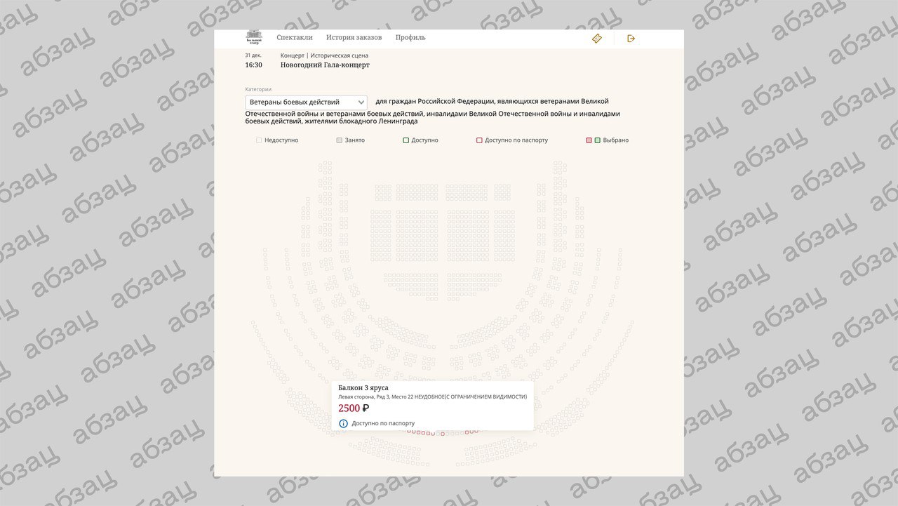 Большой театр продаёт билеты по категориям. Среди них есть и льготные – для участников военных действий. Как удалось выяснить «Абзацу», эти места расположены на галёрке и имеют ограниченную видимость. За возможность посмотреть представление «одним глазком» необходимо заплатить от 300 до 2500 рублей.