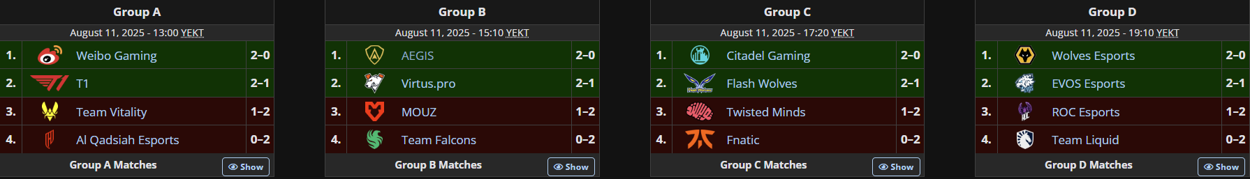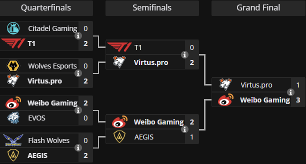 Коллектив из Китая стал победителем турнира и заработал $150 тыс. VP за вторую строчку получила $70 тыс. T1 и AEGIS разделили между собой 3-4 место, что принесло им по $40 тыс.
