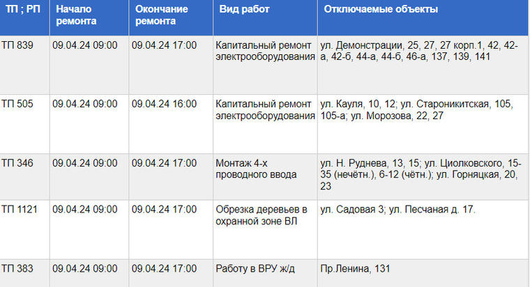 Публикуем полный список адресов, где 9 апреля 2024 года не будет света.
