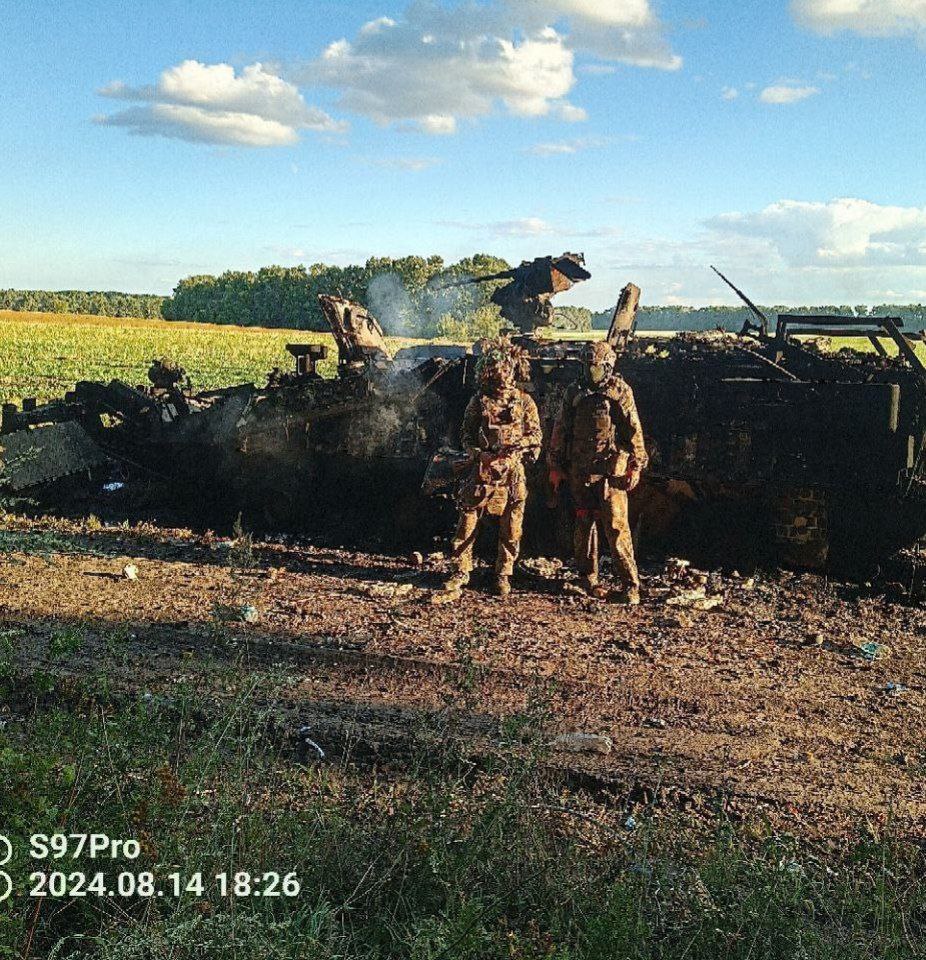 Уничтоженный американский БТР "Страйкер" с минным тралом в Курской области.