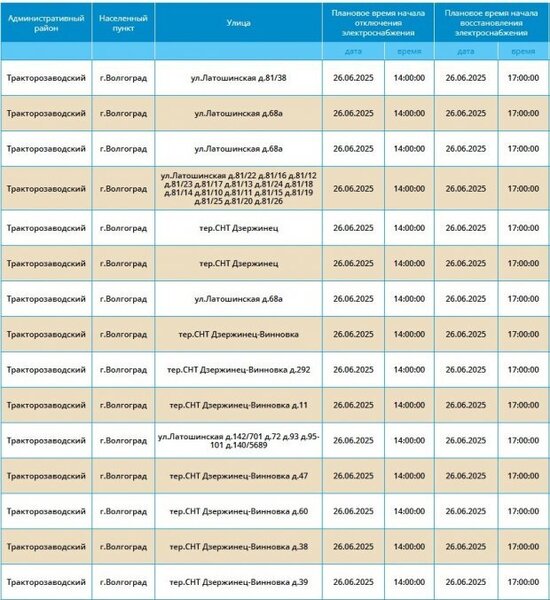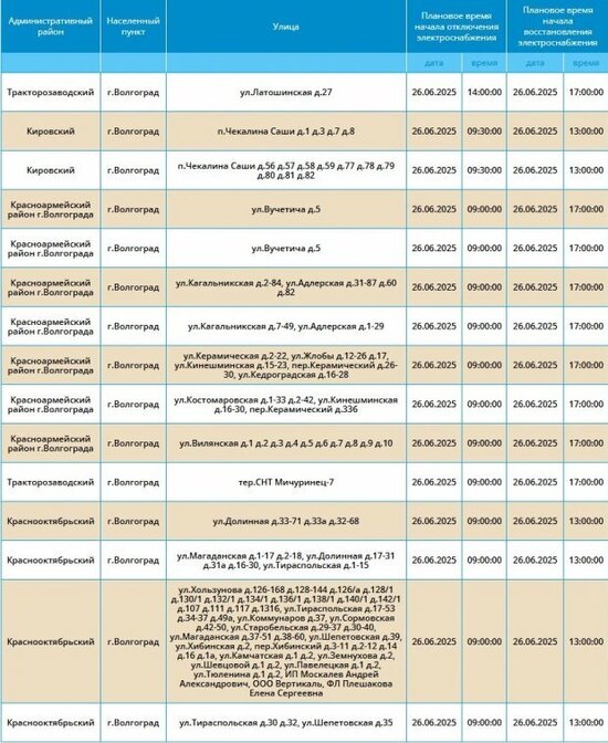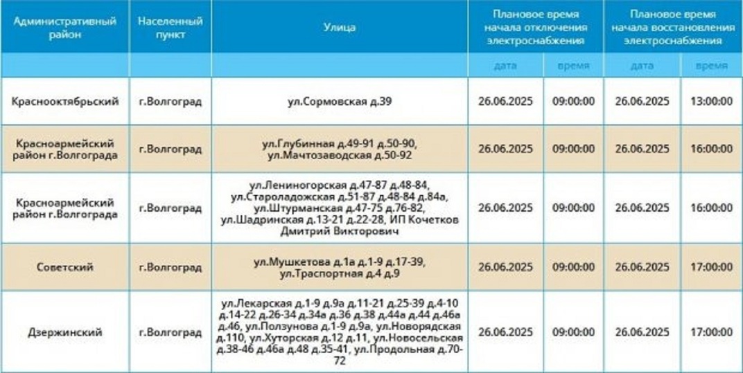 Шесть районов Волгограда 26 июня временно останутся без света