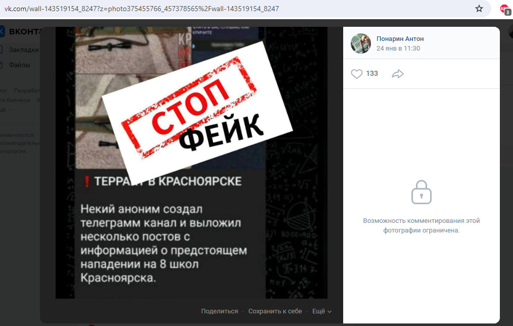 Если открыть фото в посте, то видно, что оно выложено с аккаунта, названного «Понарин Антон». В Красноярске есть человек по имени Антон Понарин, сотрудник ЦУР (Центр управления регионами) Красноярского края. ЦУР среди прочего помогает госучреждениям вести группы в VK. Мы спросили Антона, выкладывал ли он этот пост. Антон ответил, что не выкладывал и никогда не администрировал данную группу.
