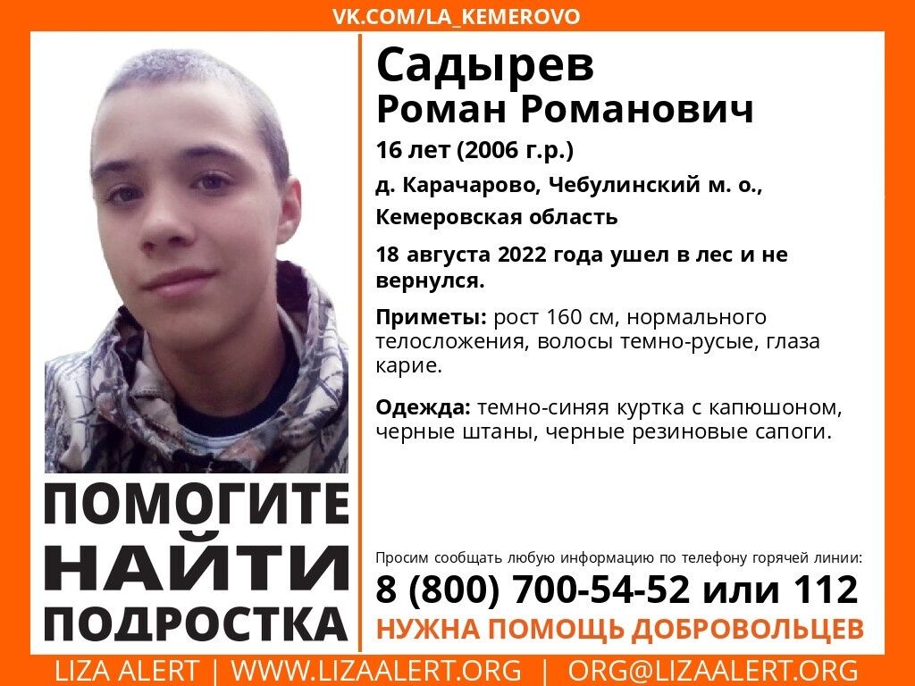 Волонтеры объявили о поиске 16-летнего Садырева Романа Романовича. Сообщается, что 18 августа он ушел в лес и не вернулся. Инцидент произошел в деревне Карачарово.