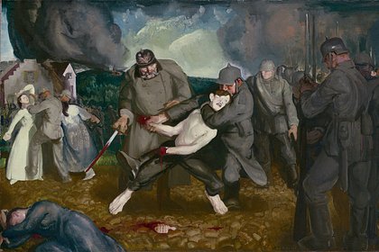 Картина Джорджа Уэсли Беллоуза «Баррикада», вдохновленная свидетельствами из доклада Брайса о том, что в битве при Монсе в августе 1914 года немецкие солдаты использовали бельгийское население в качестве живого щита