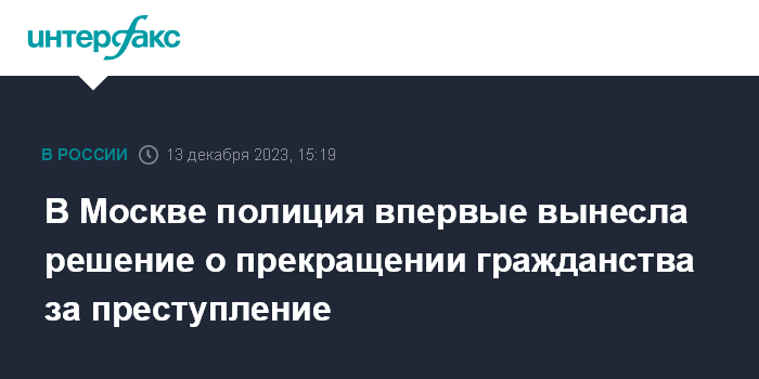 Москва. 13 декабря. INTERFAX.RU - Московские полицейские впервые вынесли решение о прекращении российского гражданства двух приезжих, которые получили паспорта граждан РФ на законных основаниях, но затем были осуждены за преступление в сфере оборота наркотиков, сообщает в среду информационный интернет-портал "МВД Медиа".