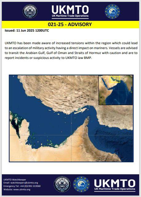 UKMTO, Консультативное коммерческое агентство Королевского флота Британии, предупреждает все суда в регионе Персидского залива, а также в Оманском заливе и Ормузском проливе об эскалацией военной ситуации.