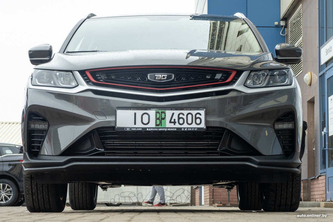 Итак, мне достался Geely Coolray 2023 года выпуска с 3-цилиндровым 1,5-литровым турбомотором (177 л. с. и 230 000 км ресурса) в средней комплектации. Это та, в которой еще нет кожи в салоне и галогенных фар, но уже есть боковые подушки и панорамная крыша. Предложили «самый популярный SUV 2023 года» (как его окрестил дилер) в сером цвете, с красной окантовкой решетки — все как положено. Скорее это был выбор без выбора: или такой, или ждать в очереди. Год назад автомобиль стоил 65 875 рублей (без допов). На момент выхода этой статьи дилеры предлагают преемника Coolray с шильдиками BelGee X50 в той же средней комплектации за 69 240.