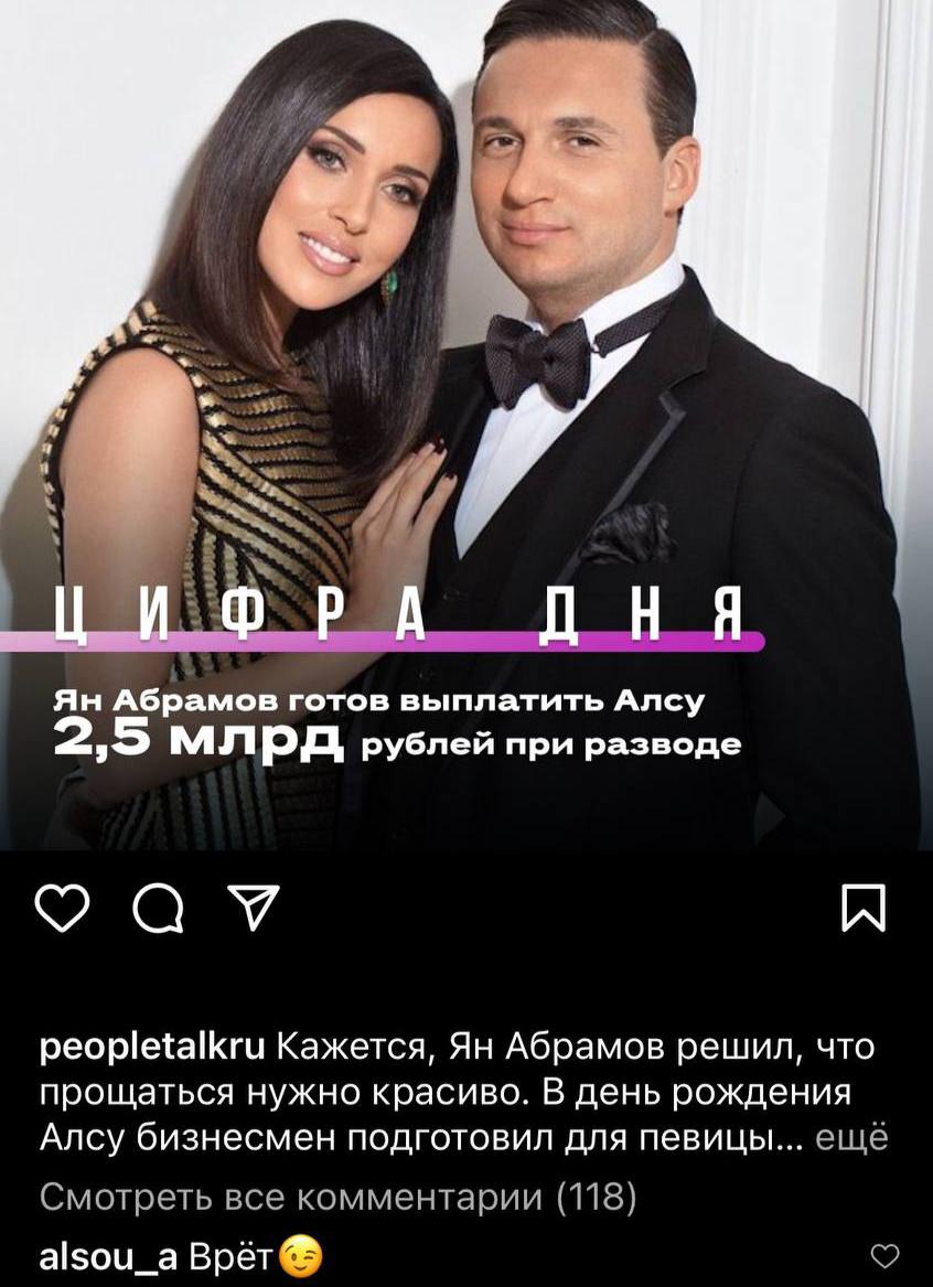 Кажется, информация про 2,5 миллиарда, которые Ян хочет оставить жене, слегка преувеличена. Алсу выдала классическое «врет» под постом об этом.