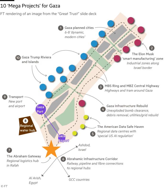 Проект восстановления анклава выглядит фантастично. Там планировали создать “Ривьеру Трампа”, “Умную промышленную зону Маска”, а также зону свободной торговли для обеспечения коридора из Индии через Ближний Восток в Европу. А всю землю в Газе хотели токенизировать и продавать инвесторам через блокчейн, доведя стоимость проекта до 320 миллиардов долларов.