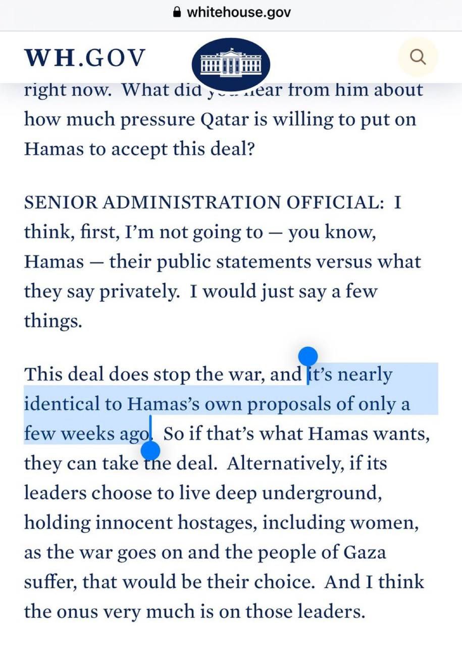 ✔️Предложение Джо Байдена о прекращении огня в секторе Газа «почти идентично собственному предложению ХАМАС, сделанному всего несколько недель назад, -