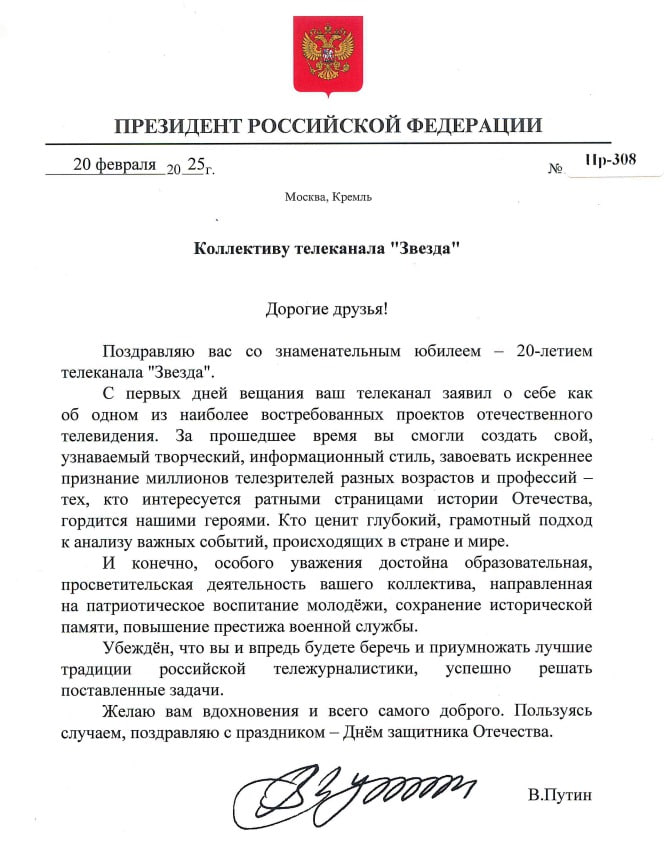👏Путин поздравил телеканал "Звезда" с 20-летием. Президент РФ отметил наш узнаваемый творческий стиль и грамотный подход к анализу важных событий. Также российский лидер назвал достойной уважения просветительскую работу коллектива телеканала, которая направлена на патриотическое воспитание, сохранение исторической памяти и повышение престижа военной службы. "Убежден, что вы и впредь будете беречь и приумножать лучшие традиции российской тележурналистики, успешно решать поставленные задачи", — написал в поздравлении Владимир Путин. Благодарим наших телезрителей и читателей за то, что все это время вы остаетесь с нами! ⭐️ Подписаться на Zvezdanews | *️⃣ Предложить новость