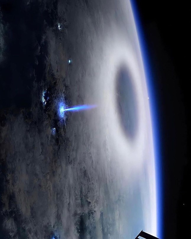 Молния, которая бьет из грозового облака вертикально вверх на границе атмосферы и космоса. Фото сделано с МКС.