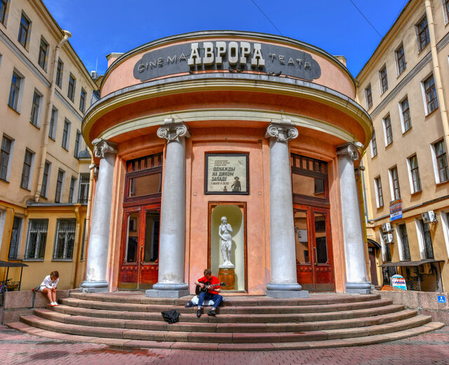 В декабре 1913-го года во дворе доходного дома книгоиздателя Глазунова открылся самый передовой синематограф в городе «Пикадилли». В 1930-м его переименовали в «Аврору» — кинотеатр стал одним из первых в СССР показывать звуковое и цветное кино. За 111 лет он пережил две революции, Великую Отечественную войну, блокаду Ленинграда и по сей день является важным местом для петербуржцев.