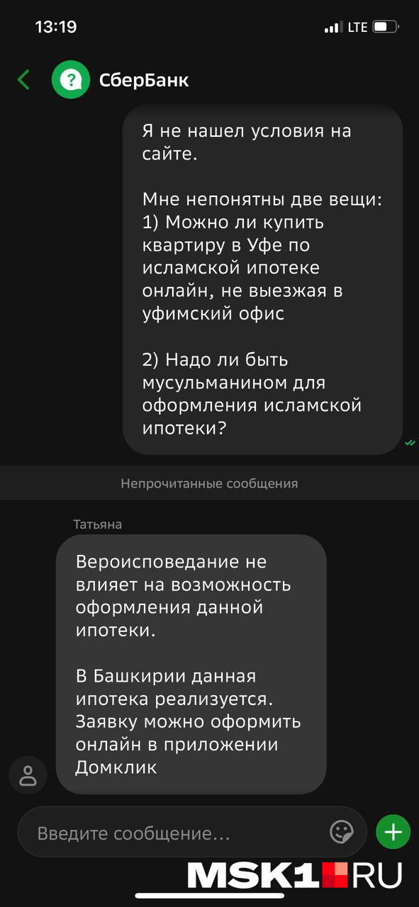 Другой сотрудник поддержки Сбера, Татьяна, подтвердила MSK1.RU, что исламскую ипотеку может оформить любой желающий. В конце ноября самый крупный банк России начал предоставлять такую услугу. Правда, пока квартиру можно купить только на территории Башкортостана или Дагестана исключительно через принадлежащий Сберу сервис «Домклик».