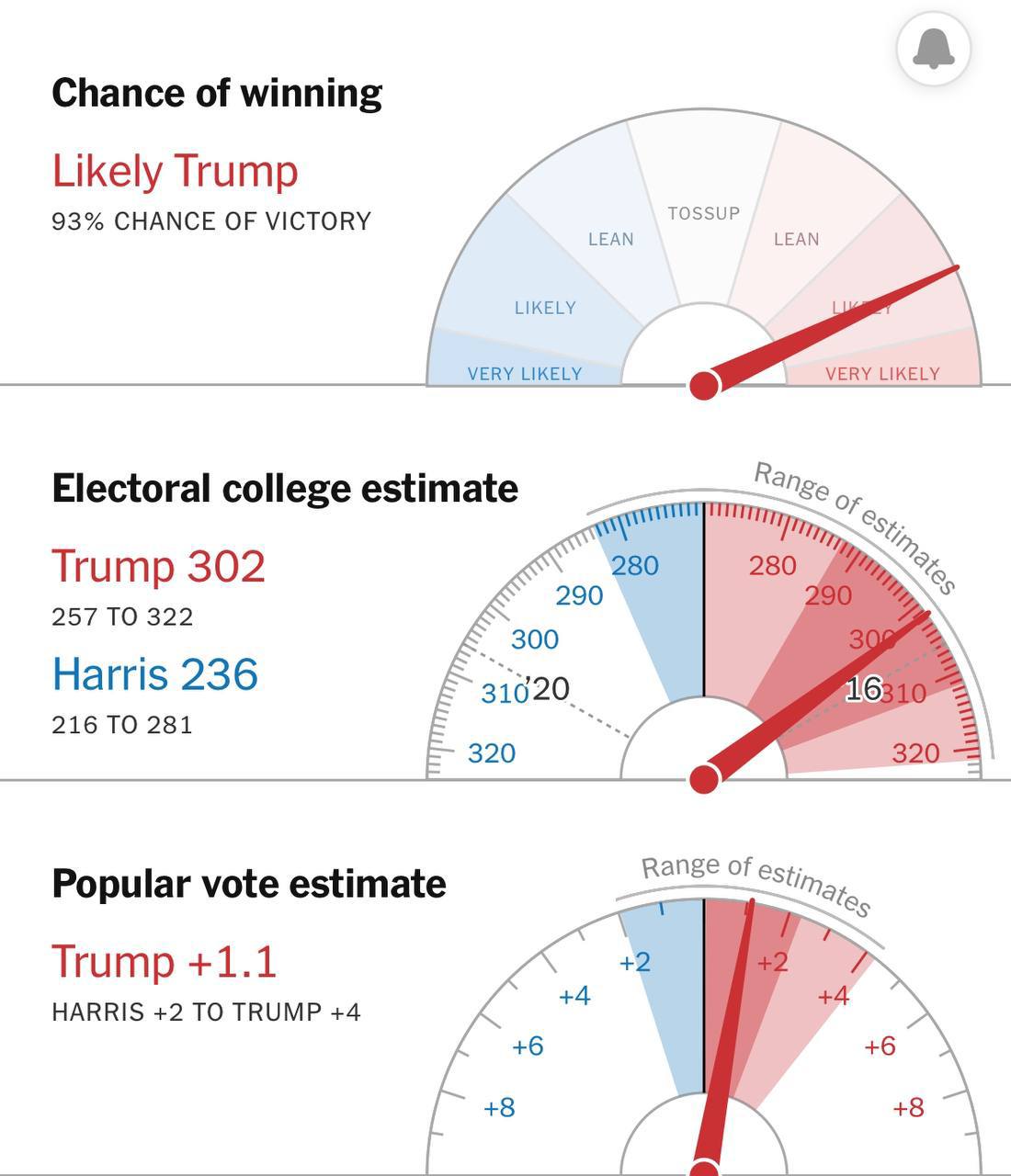 ✔️Прогноз в режиме реального времени от New York Times теперь показывает вероятность победы Дональда Трампа в 93%.