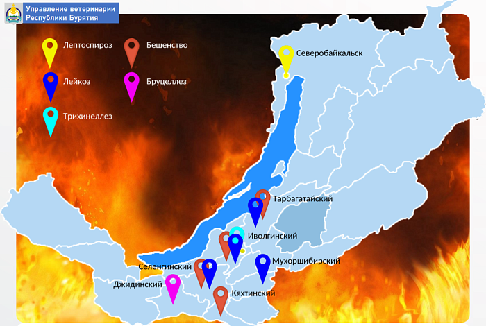 В Тарбагатайском районе зарегистрирован один неблагополучный пункт по бешенству диких животных и один неблагополучный пункт по лейкозу КРС. Мухоршибирский район – 1 неблагополучный пункт по лейкозу КРС. Кяхтинский район – 1 неблагополучный пункт по бешенству диких животных. Джидинский район – 1 неблагополучный пункт по бруцеллезу. В Северобайкальске один неблагополучный пункт по лептоспирозу. В неблагополучных пунктах под контролем ветеринарной службы проводится работа по ликвидации болезни.
