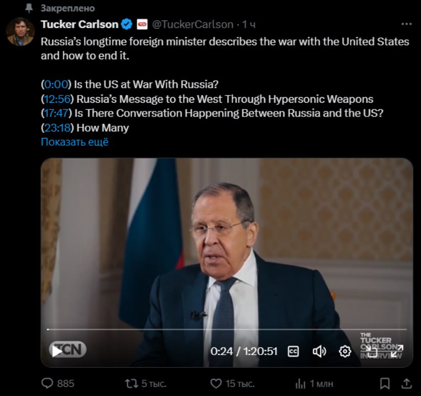 Более миллиона просмотров набрало интервью Сергея Лаврова Такеру Карлсону в соцсети Х за час с небольшим.