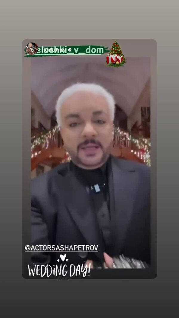 Затем пару ждал сюрприз на улице. К банкетному залу приехал огромный автобус с десятками неизвестных мужчин. Ими оказались фанаты московского «Спартака», которые в честь свадьбы артиста с файерами спели свой гимн — песню МакSим «Знаешь ли ты».