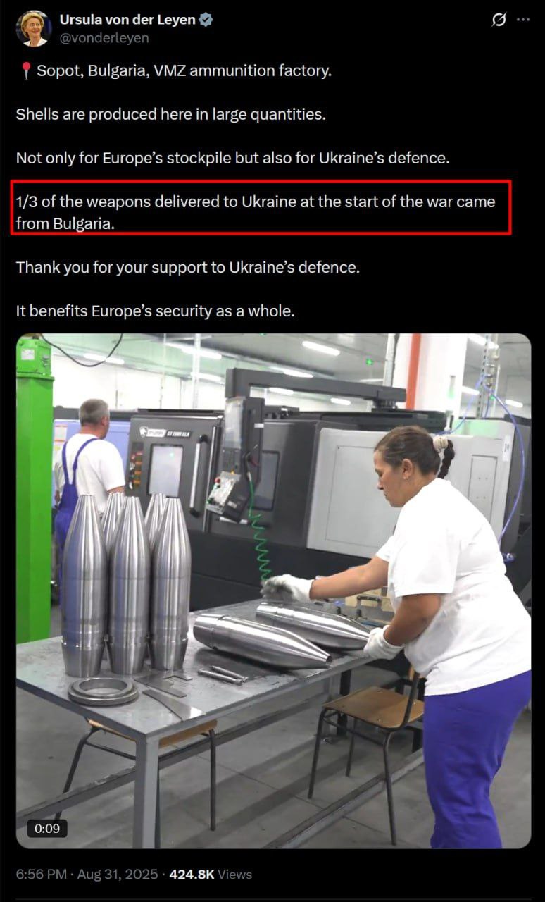 ❗️Глава Европейской комиссии Урсула фон дер Ляйен похвалила оборонную промышленность Болгарии во время своего визита, отметив, что «треть всего оружия, использованного Украиной с начала войны, поступила из Болгарии»