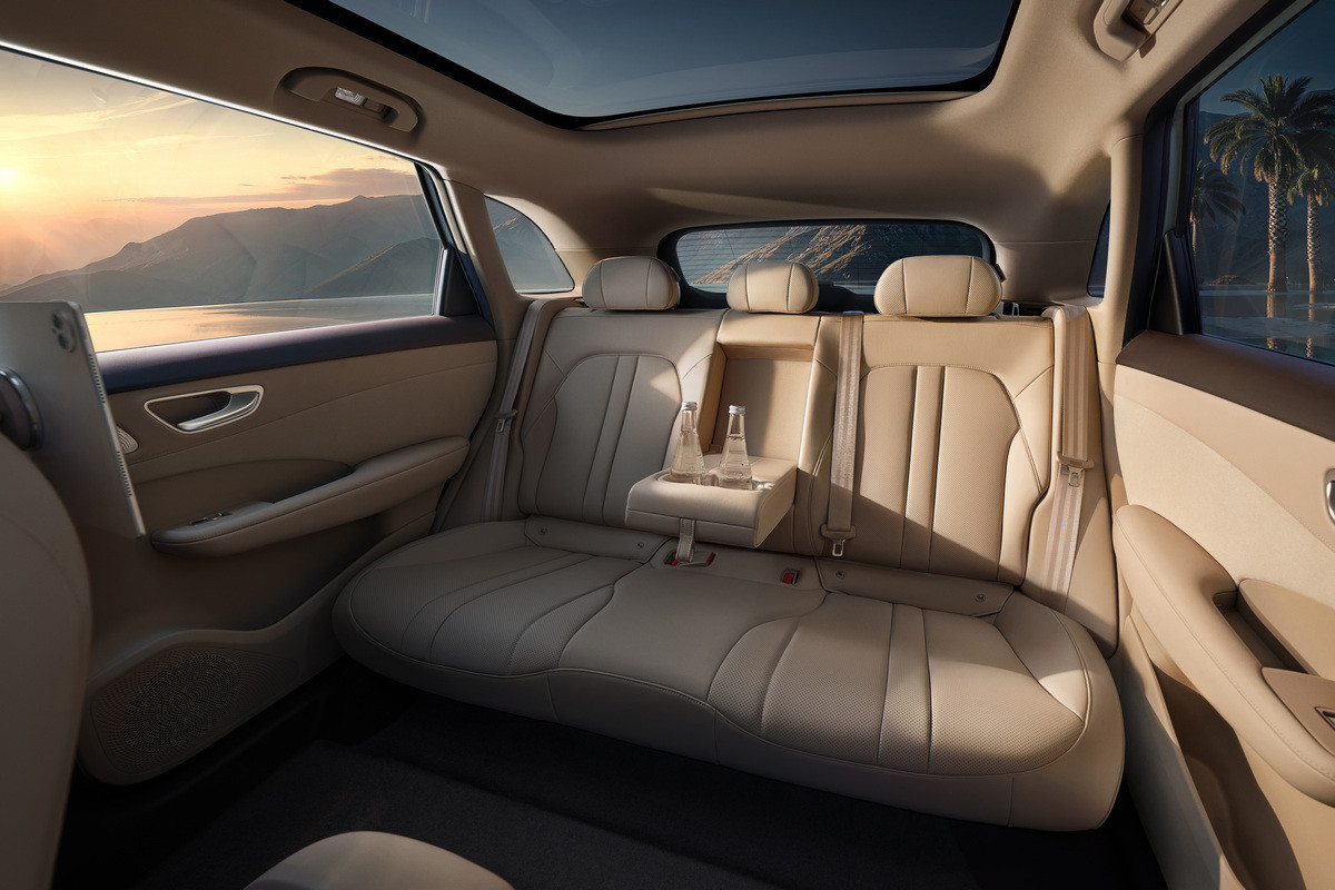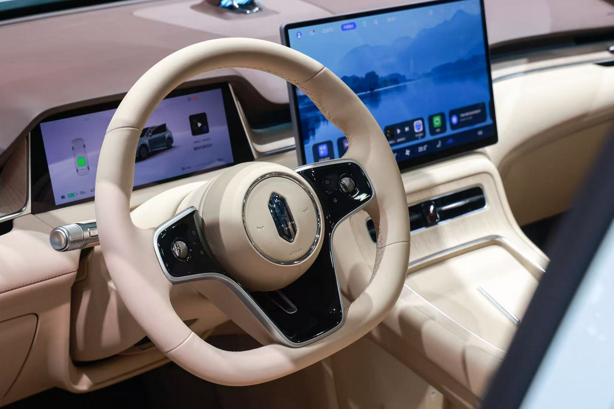 Интерьер тоже оформлен в общекитайском стиле. Тут раздельные экраны приборки (10,25 дюйма) и мультимедийной системы (15,6 дюйма), трехспицевый приплюснутый руль и двухэтажный центральный тоннель, в верхней части которого расположены площадка для беспроводной зарядки смартфона (50 Вт) и два неприкрытых подстаканника. Поверх передней панели – дополнительный динамик. Разумеется, вся электроника – от Huawei.