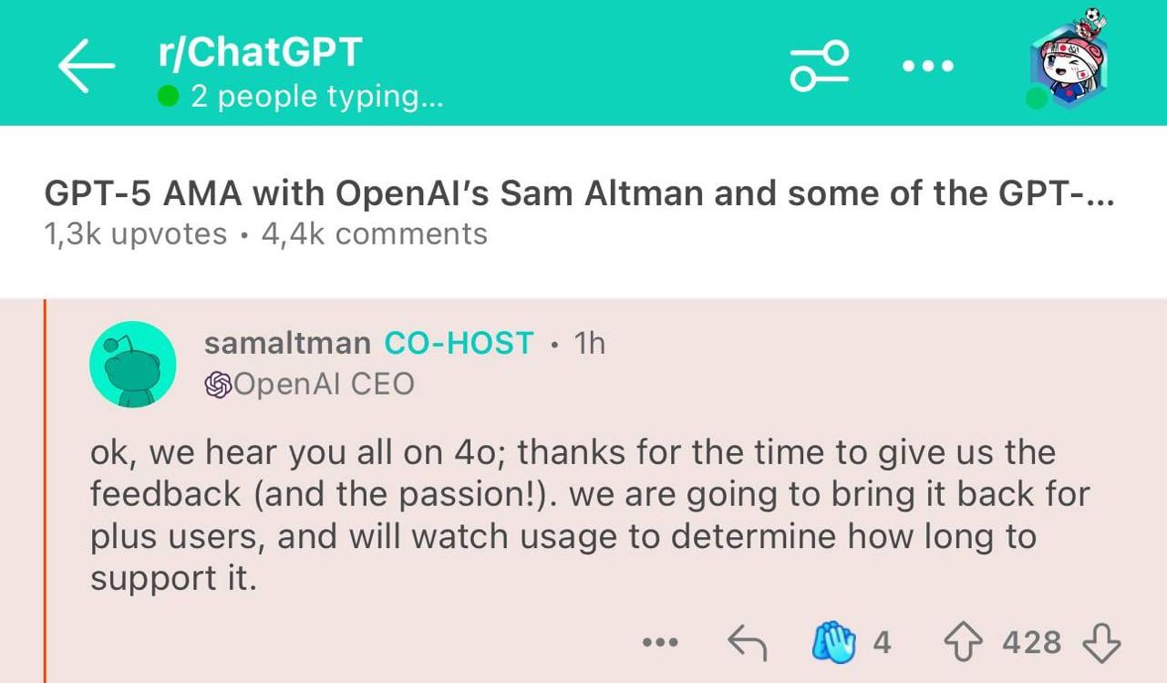❗️Сверхинтеллект ВСЁ: OpenAI возвращает GPT-4o после жалоб пользователей на GPT-5