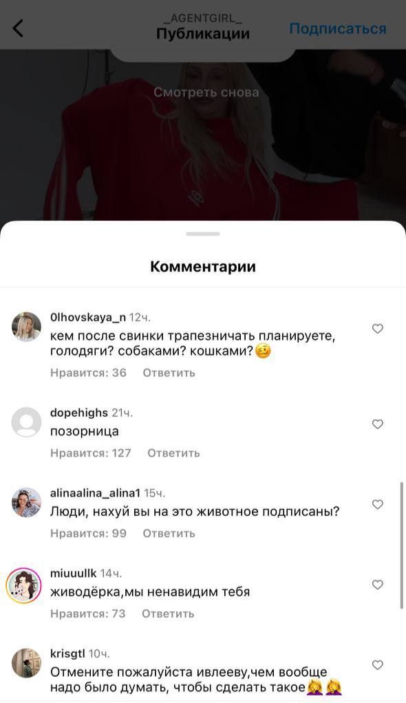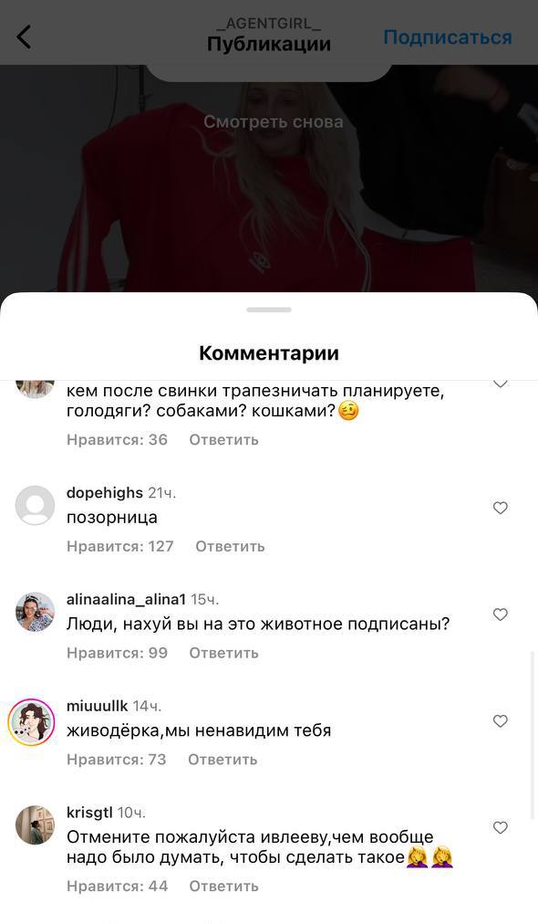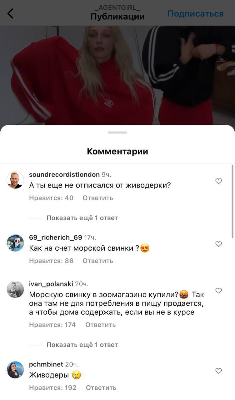 Девочки, а у нас, кстати, отмена Насти Ивлеевой после того, как она предложила гостье своего шоу ВКонтакте Agent Show сожрать предварительно сваренную морскую свинку. В комментариях на странице Насти в запрещенной сети спрашивают, нельзя ли привлечь ведущую за живодёрство. Ждем комментарий самой Ивлеевой, редакторов и продюсеров этого шоу. Эфир из соцсети зачем-то удален. Хотя все прекрасно знают, что удалить из интернета ничего нельзя. Видео 18+.