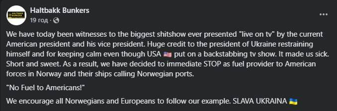 π’οΈΠΠ΄Π½Π° ΠΈΠ· ΠΊΡΡΠΏΠ½Π΅ΠΉΡΠΈΡ Π½ΠΎΡΠ²Π΅ΠΆΡΠΊΠΈΡ ΠΊΠΎΠΌΠΏΠ°Π½ΠΈΠΉ ΠΏΠΎ ΠΏΡΠΎΠΈΠ·Π²ΠΎΠ΄ΡΡΠ²Ρ ΡΠΎΠΏΠ»ΠΈΠ²Π° Π΄Π»Ρ ΠΌΠΎΡΡΠΊΠΈΡ ΡΡΠ΄ΠΎΠ², Haltbakk Bunkers, ΠΎΠ±ΡΡΠ²ΠΈΠ»Π°, ΡΡΠΎ Π±ΠΎΠ»ΡΡΠ΅ Π½Π΅ Π±ΡΠ΄Π΅Ρ ΠΏΠΎΡΡΠ°Π²Π»ΡΡΡ ΡΠΎΠΏΠ»ΠΈΠ²ΠΎ Π½Π° ΠΊΠΎΡΠ°Π±Π»ΠΈ ΠΠΠ‘ Π‘Π¨Π. Haltbakk ΠΏΡΠΈΠ·Π²Π°Π»Π° ΠΈ Π΄ΡΡΠ³ΠΈΠ΅ Π΅Π²ΡΠΎΠΏΠ΅ΠΉΡΠΊΠΈΠ΅ ΠΊΠΎΠΌΠΏΠ°Π½ΠΈΠΈ ΠΏΡΠ΅ΠΊΡΠ°ΡΠΈΡΡ ΠΎΠ±ΡΠ»ΡΠΆΠΈΠ²Π°Π½ΠΈΠ΅ Π°ΠΌΠ΅ΡΠΈΠΊΠ°Π½ΡΠΊΠΈΡ Π²ΠΎΠΉΡΠΊ