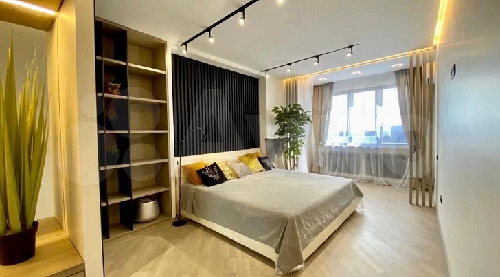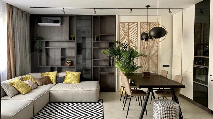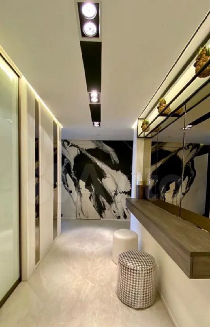 Кухня совмещена с гостинной и заниает 35м², имеются две изолированные спальни площадью 17 и 22 м², а также два санузла. Кроме того, в квартире имеется мастер-спальня со своей гардеробной. Стоимость квартиры достигает 27 млн рублей.