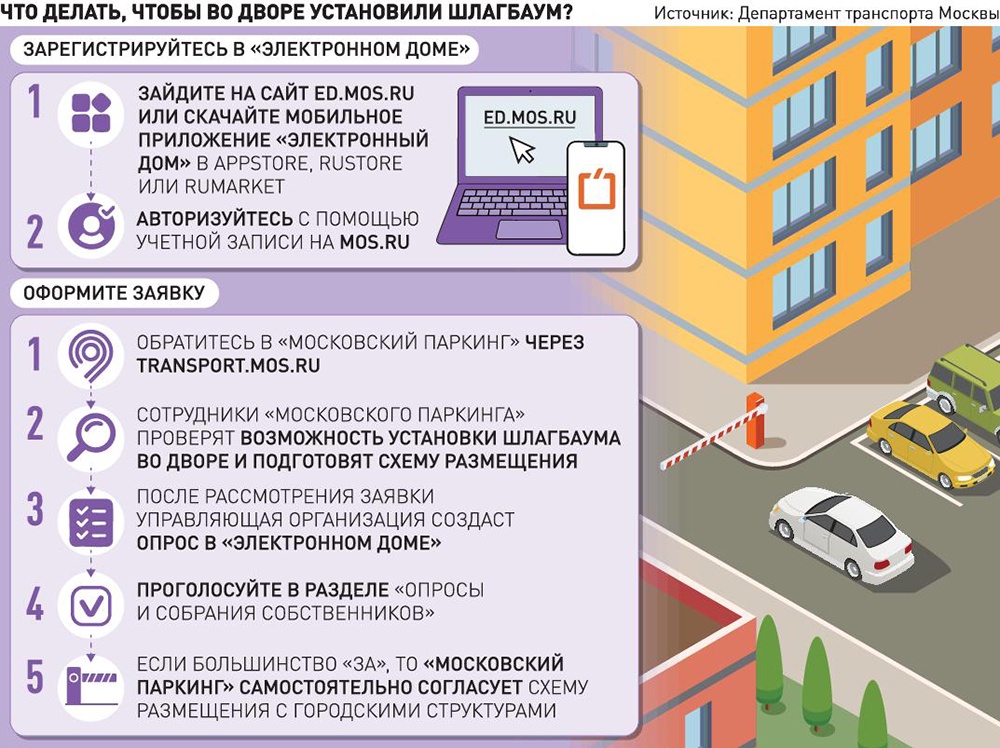 Теперь горожанам нужно лишь оставить заявку на сайте transport.mos.ru. Предварительно необходимо авторизоваться в "Электронном доме" через учетную запись на mos.ru - так вы подтвердите свою личность и адрес проживания. Дальше сотрудники "Московского паркинга" проверят возможность установки шлагбаумов и сами составят схему их размещения. После этого управляющая компания создаст опрос в "Электронном доме", и если большинство жильцов будут "за", то сотрудники согласуют схему с городскими структурами.