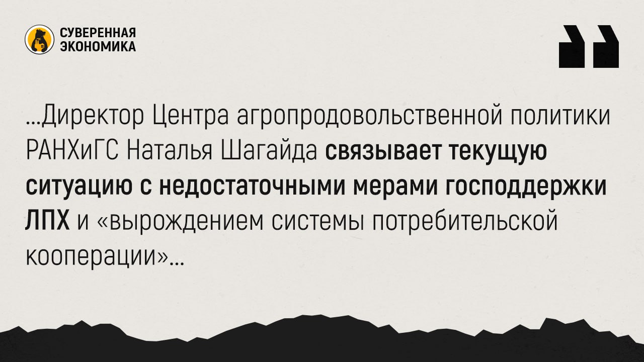 Директор Центра агропродовольственной политики РАНХиГС Наталья Шагайда связывает текущую ситуацию с недостаточными мерами господдержки ЛПХ и «вырождением системы потребительской кооперации». Государство концентрируется на помощи крупным агрохолдингам стратегического значения, добавляет доцент кафедры статистики РЭУ им. Г. В. Плеханова Ольга Лебединская.