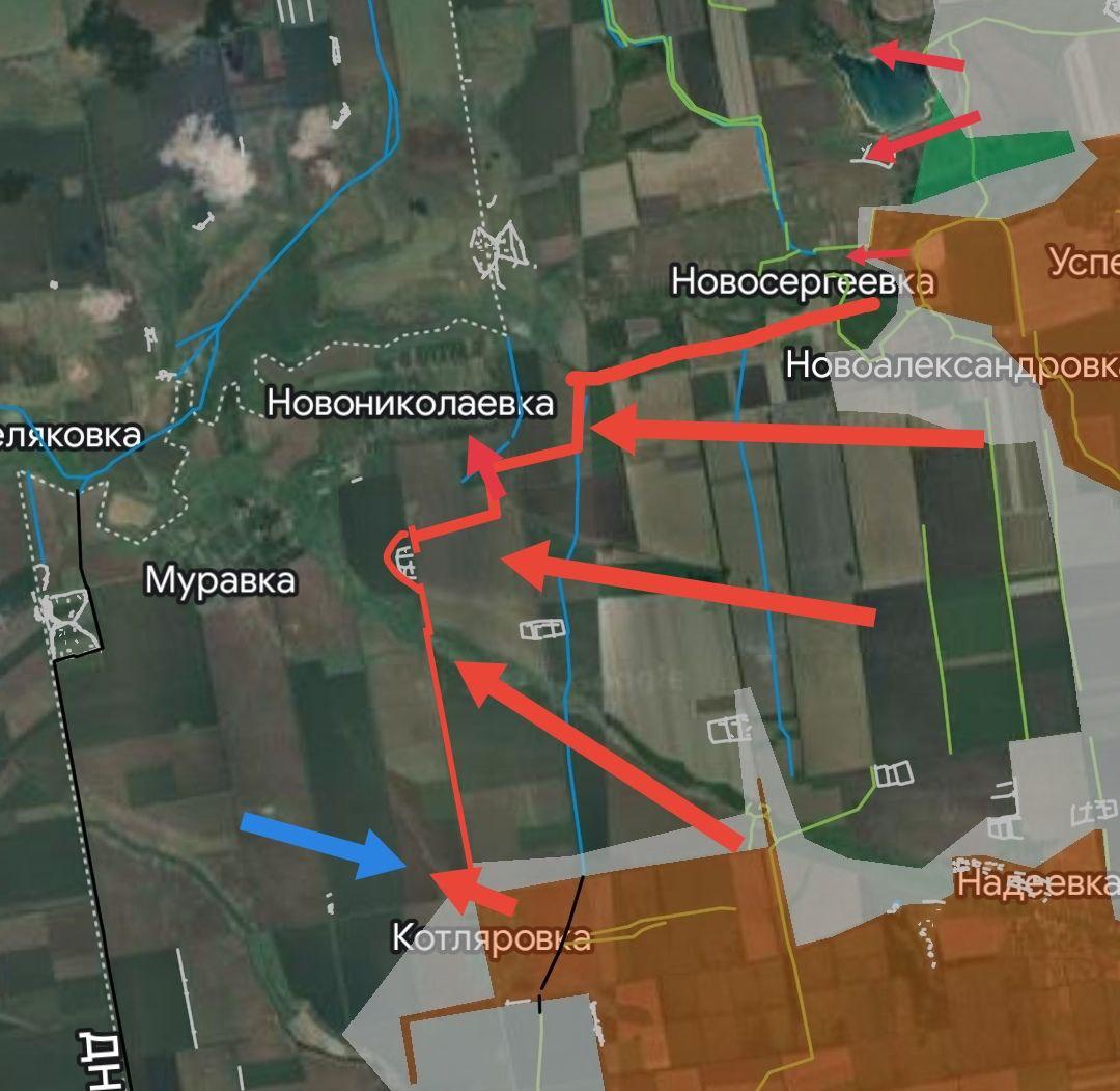 Ожесточённые встречные бои — северо-западнее Котляровки, т.к. продвижение наших подразделений здесь грозит изоляцией Муравки и Новониколаевки от логистического маршрута из Новопавловки и выходом наших войск к последней.