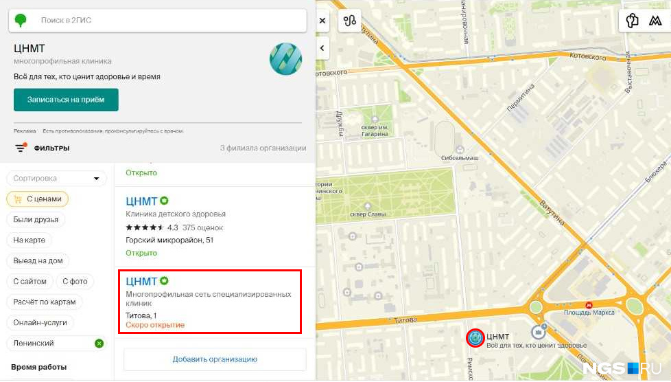 Между тем, в профиле ЦНМТ в 2ГИС новый адрес — улица Титова, 1 — уже обозначен. С пометкой «скоро открытие».