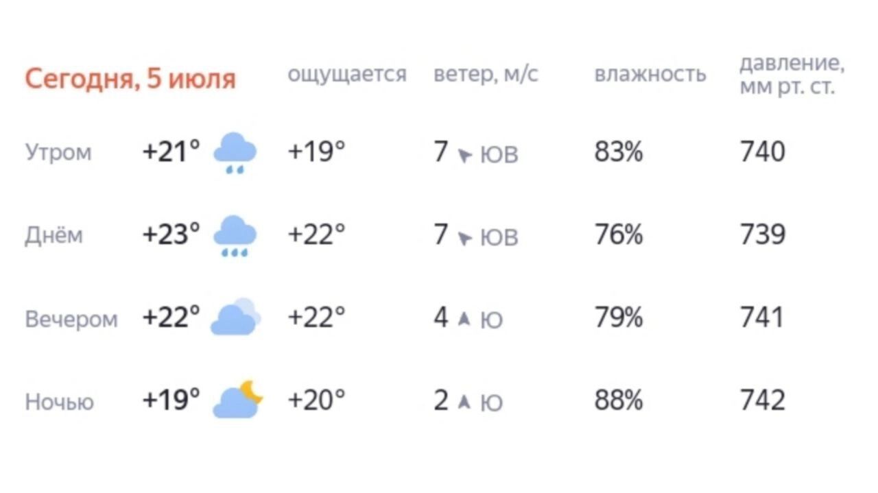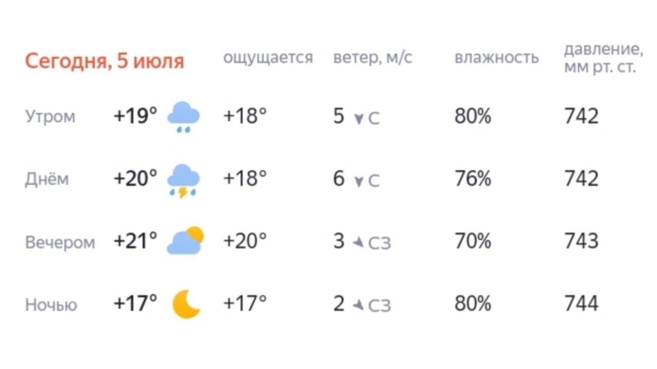 В субботу, 5 июля, средняя температура в ХМАО составит +18…+23 градуса днем, и +12…+17 градусов ночью. При этом в восточной части прогнозируют дневную жару до +26…+31 градуса. Также обещают грозы и дожди. Ветер — северный, 6-11 м/с. Возможны порывы ветра до 14 м/с.