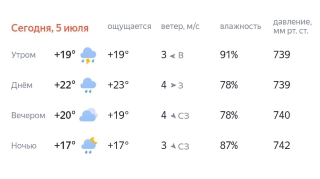 В Сургуте почти весь день будет идти дождь, а утром обещают и грозу. В утренние часы воздух прогреется до +19 градусов, днем — до +22 градусов. К вечеру немного похолодает — до +20 градусов, ночью — +17 градусов. Ветер — восточный с переходом в западный и северо-западный, 3-4 м/с.