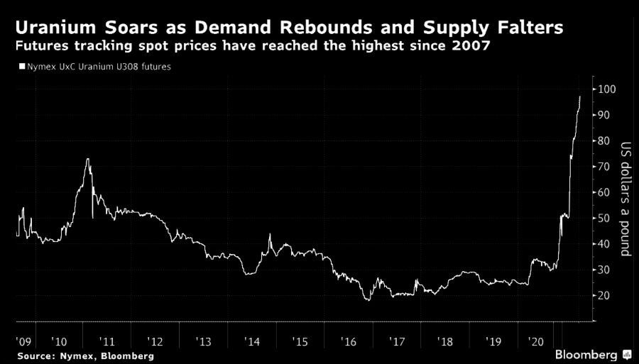 Биржевые цены на уран впервые с 2007 года превысили отметку $97 за фунт. Это произошло на фоне роста спроса и сбоев поставок. В частности, европейские АЭС не получают уран из Нигера после военного переворота в прошлом году. @banksta