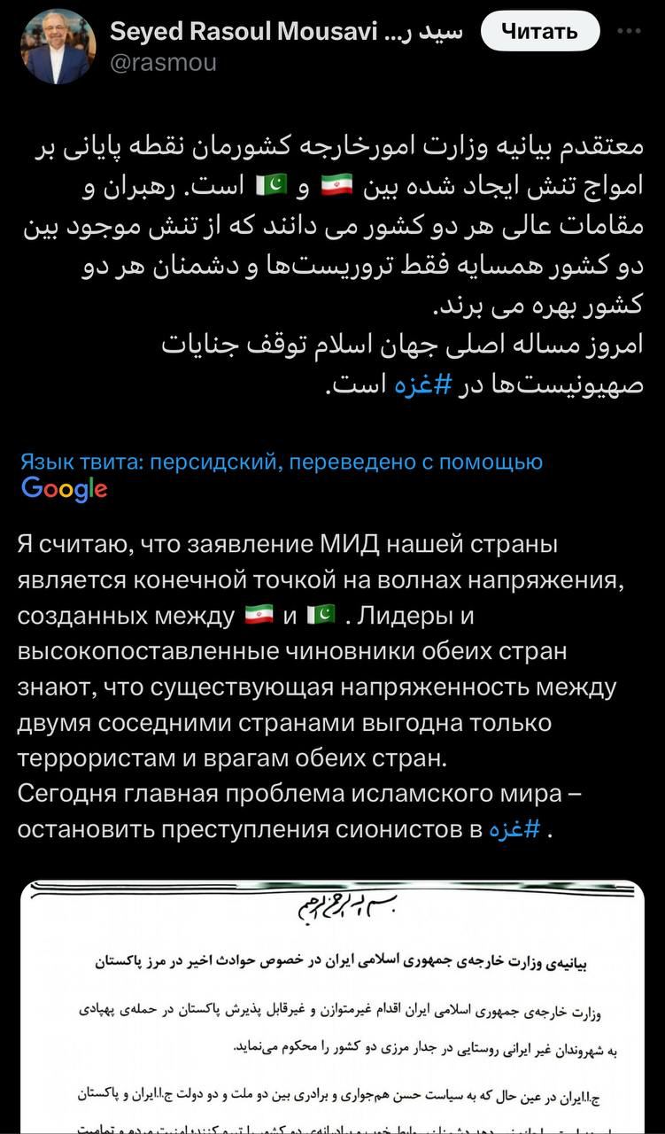 Дополнительный министр иностранных дел Пакистана Рахим Хаят Куреши также обменялся сообщениями на X со своим иранским коллегой Сейедом Расулом Мусави в знак того, что обе стороны намерены решать вопросы посредством диалога