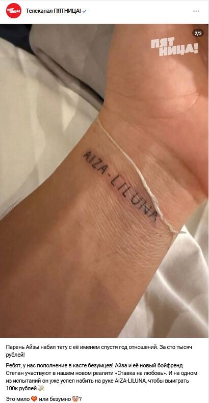 Степан Кузменко — новый бойфренд Айзы, с которым она снимается в шоу телеканала «Пятница» «Ставка на любовь». Их отношениям уже год, и пара решила проверить на прочность их связь, да и денег заработать. Победа сулит влюбленным денежный приз. В качестве одного из испытаний Степану предложили набить на теле имя возлюбленной — AIZA-LILUNA. Так он смог бы заработать деньги для личного счета. И он согласился без раздумий. Татуировка появилась на запястье парня.