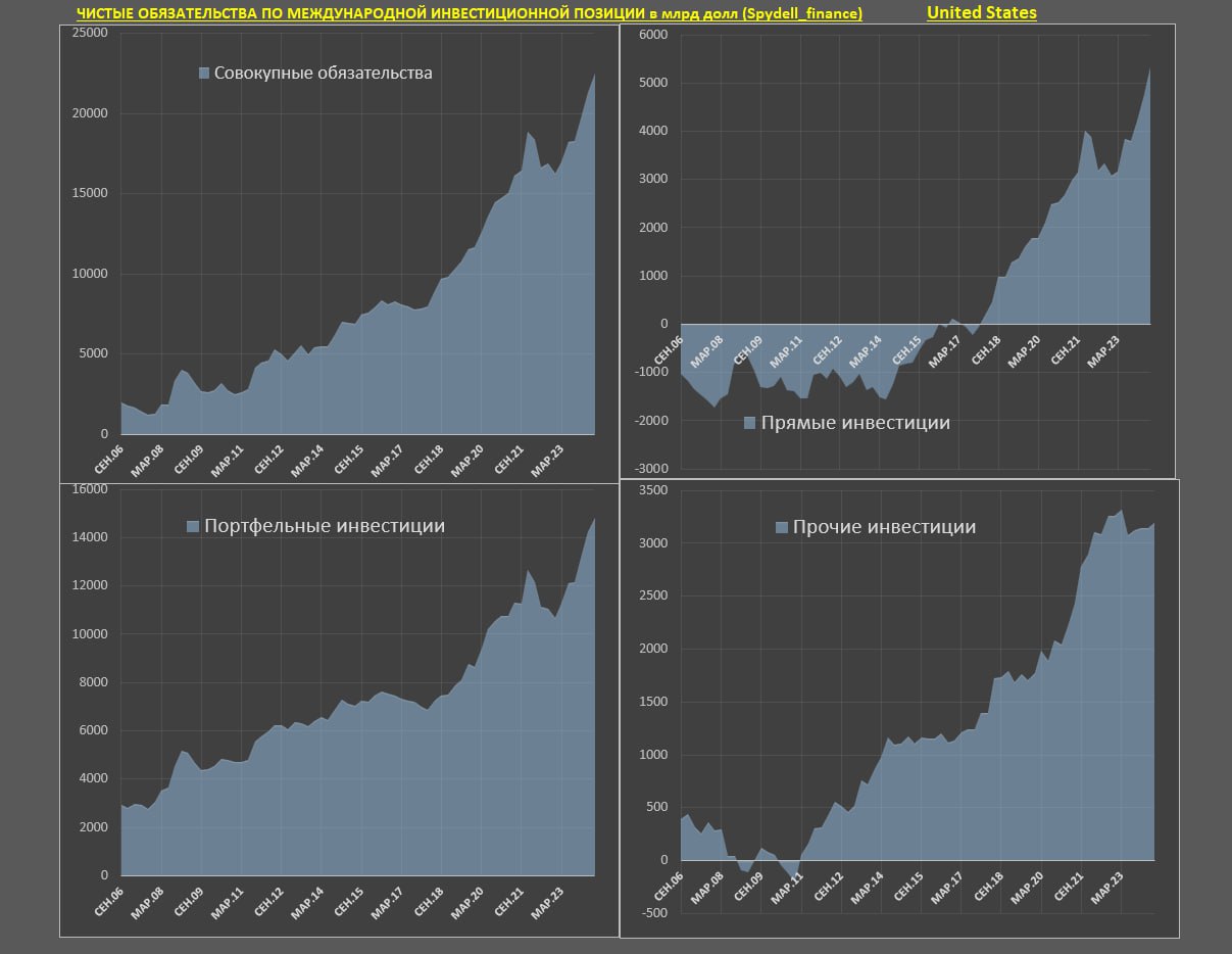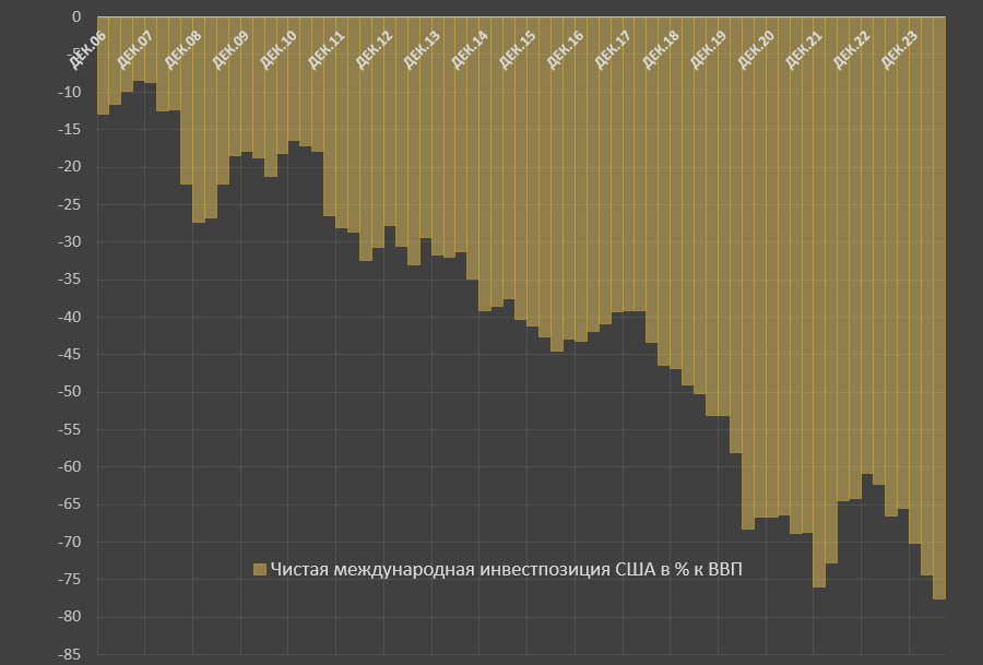 За 5 лет увеличение дефицита по чистой международной инвестиционной позиции США достигло почти 12 трлн! (10.7 -> 22.5 трлн), за два года дефицит расширился на 6 трлн, а за год свыше 3.2 трлн согласно собственным расчетам на основе статистики BEA и IMF на 2 квартал 2024 (последние доступные детализированные данные).