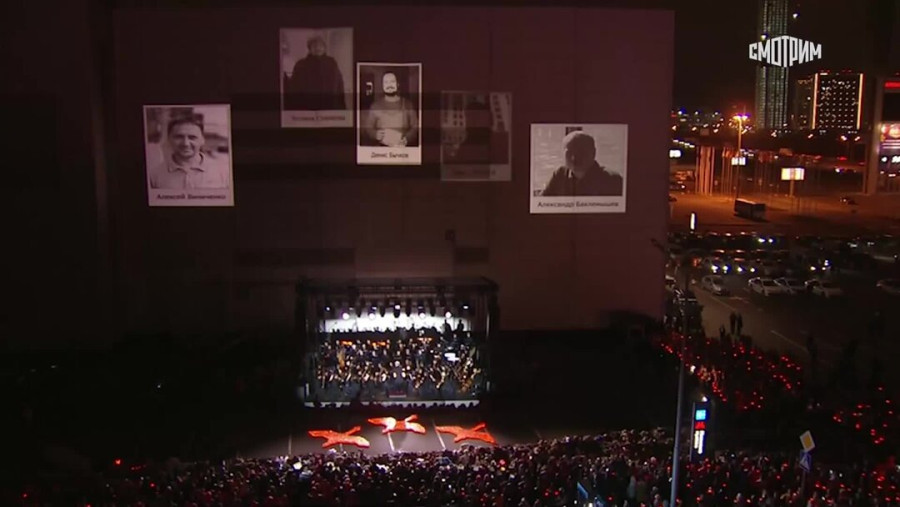 Мероприятие началось с минуты молчания, во время которой на стену здания «Крокус Экспо» проецировались изображения летящих журавлей и распускающихся крокусов. Когда оркестр заиграл, проекция изменилась на фотографии погибших. Музыканты исполнили отрывки из «Ромео и Джульетты» Сергея Прокофьева.
