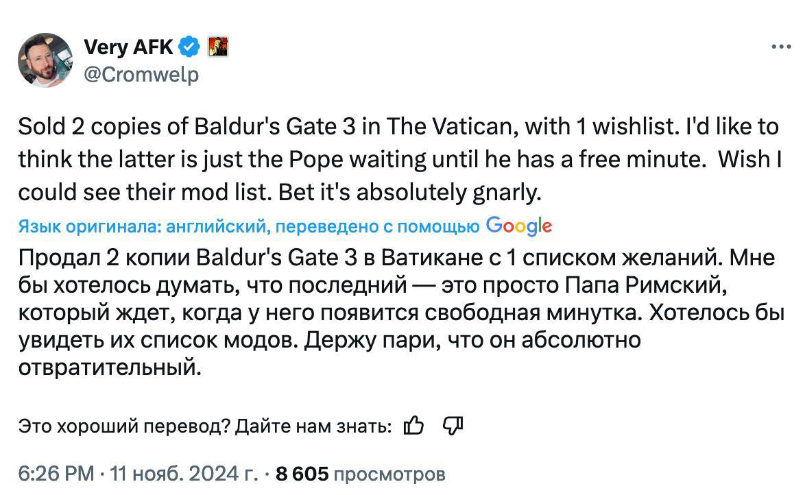 Богоугодно: Baldur’s Gate III купили два человека в Ватикане, ещё один добавил игру в вишлист — об этом рассказал издатель игры Майкл Доус