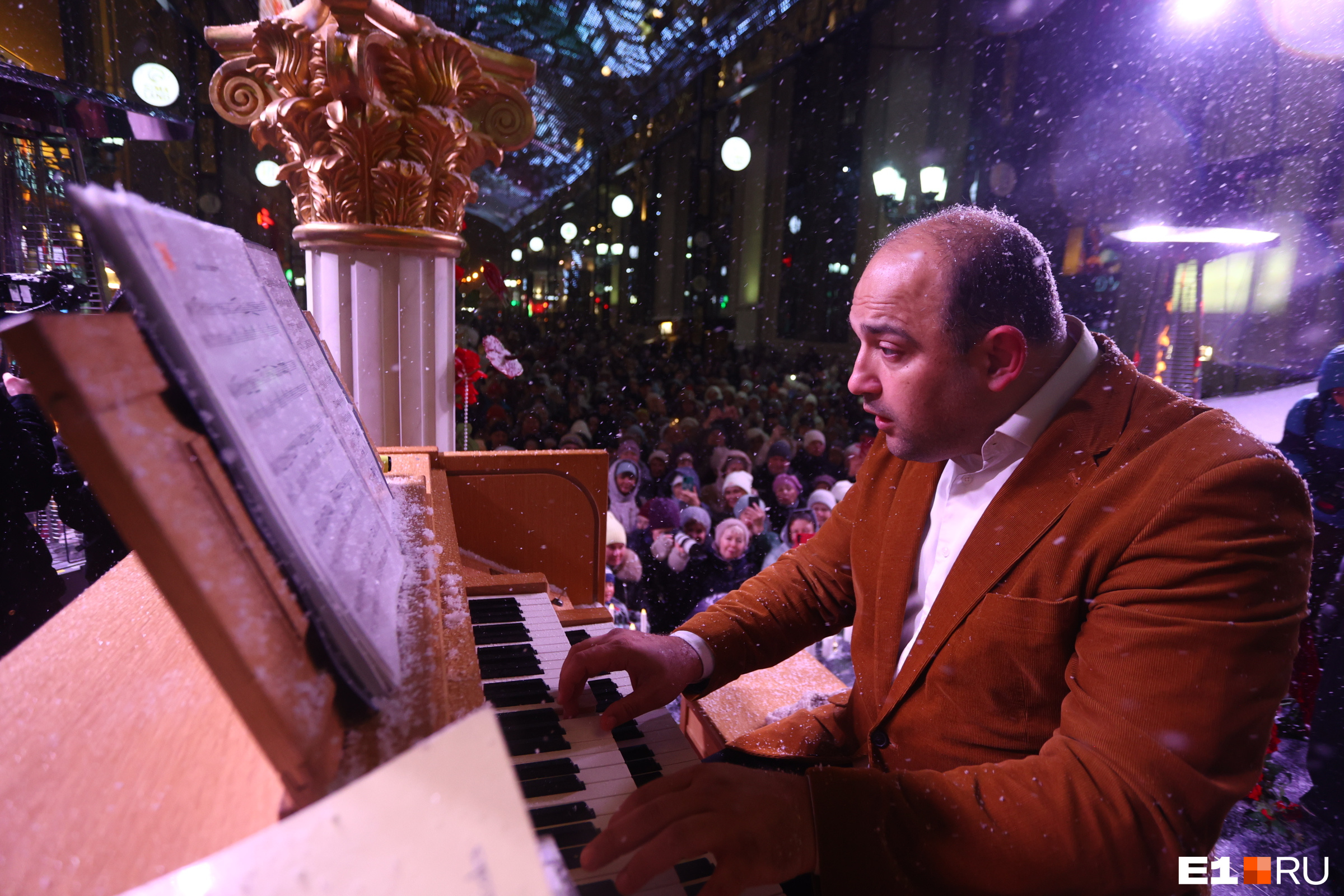 Органист Тарас Багинец играет под медиаэкраном на заснеженной улице Вайнера
