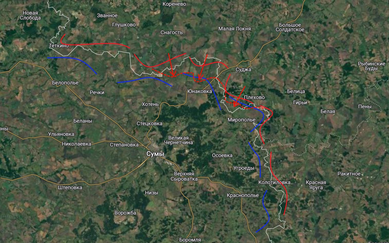 А фронт постепенно приближается к Сумам. И до их окраины нам осталось 25 км. И стоит нам пройти еще хотя бы 10 км и наши дроны смогут блокировать въезды в город.